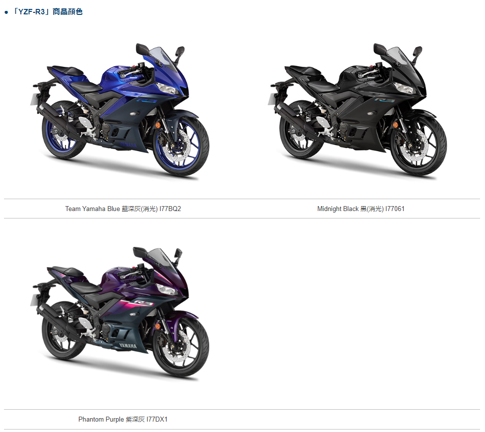 In 2023, the YZF-R3 will be introduced in three colors: "Team Yamaha Blue Blue (matte)", "Midnight Black (matte)" and "Phantom Purple Dark Gray". The characteristics of each car color are the followings: